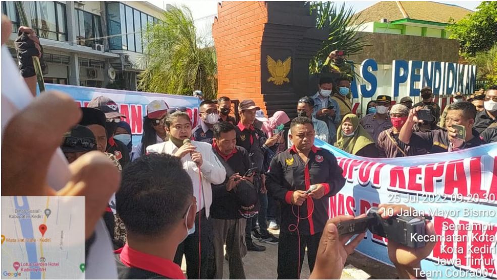 Kediri Kota – Javanewsonline.co.id | Puluhan massa yang tergabung dalam Aliansi Kediri Bersatu menggelar aksi unjuk rasa didepan Kantor Dinas Pendidikan Kota Kediri, Senin (25/7).