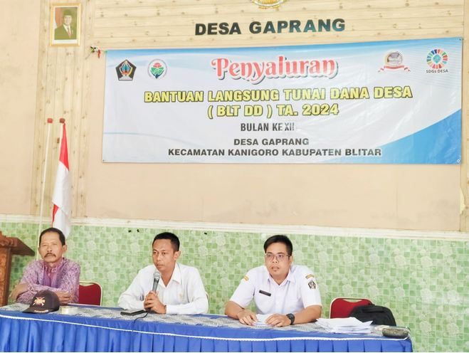 Blitar – Javanewsonline.co,.id | Pemerintah Desa Gaprang, Kecamatan Kanigoro, Kabupaten Blitar, secara resmi menyerahkan Bantuan Langsung Tunai Dana Desa (BLT-DD) tahap akhir untuk tahun anggaran 2024. Penyerahan bantuan ini dilaksanakan di ruang pertemuan Balai Desa Gaprang pada Rabu (18/12), dengan dihadiri oleh Kepala Desa, Ketua Badan Permusyawaratan Desa (BPD), serta Ketua PPKD bidang BLT-DD.