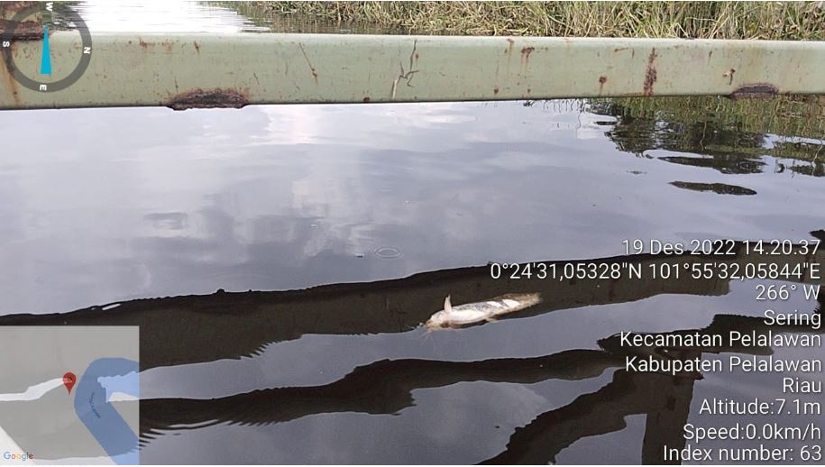 Dari informasi warga Desa Sering, terkait ikan mengapung atau mabuk di permukaan anak Sungai Suak Tigo, Tim media Java News Erizal, bersama Busernews24.com Dedy Rizaldi, yang merupakan Ketua dari salah satu Organisasi wartawan di Kabupaten Pelalawan, yaitu Ketua PWMOI Kabupaten Pelalawan, melakukan investigasi di sepanjang aliran Sungai Suak Tigo (Muara Sungai). “Di hulu di luar pembatas plang lokasi PT RAPP, kami menemukan seekor ikan mengapung berasal dari hilir Sungai Suak Tigo,” ujarnya.