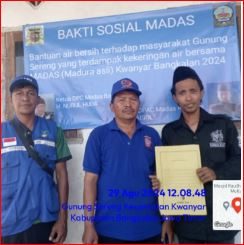 Mereka mengirimkan air bersih menggunakan mobil tangki ke Desa Gunung Sereng, Dusun Laok Gunung. “Kami sangat berterima kasih kepada Dinsos dan Ketua Madas Kwanyar yang telah memberikan fasilitas air bersih bagi kami,” ucap salah satu warga.