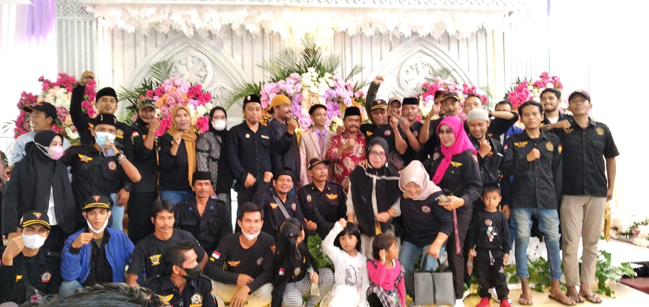 Ketua DPAC LAPBAS Padarincang beserta anggota foto bersama mempelai didampingi Ketua Umum, mereka semua yang hadir mengucapkan selamat menempuh hidup baru. (Cecep)