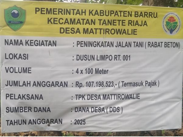 Barru – javanewsonline.co.id Pembangunan jalan tani di Desa Mattirowalie, Kabupaten Barru, Sulawesi Selatan, dilaporkan hampir rampung dan menuai apresiasi dari warga setempat. Proyek infrastruktur yang strategis ini diawasi ketat oleh Tim Pelaksana Kegiatan (TPK) desa dan merupakan bagian dari Musyawarah Rencana Pembangunan (Musrenbang) tahun 2025.