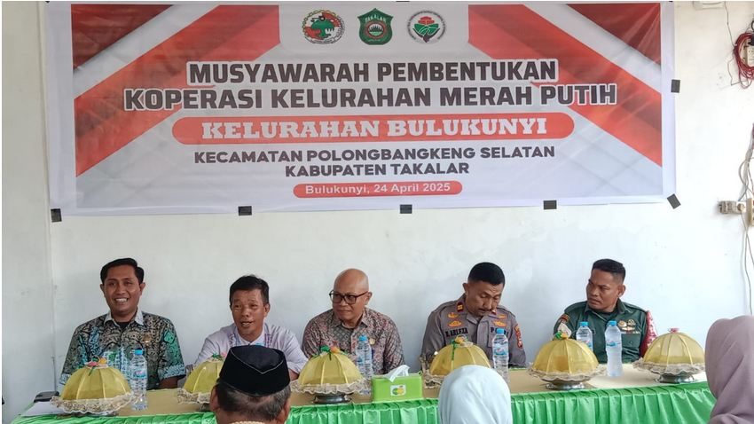 Takalar — Javanewsonline.co.id | Dalam upaya memperkuat perekonomian masyarakat melalui model usaha berbasis koperasi, Kelurahan Bulukunyi, Kecamatan Polongbangkeng Selatan (Polsel), Kabupaten Takalar, resmi membentuk Koperasi Merah Putih, Kamis (25/4/2025). Pembentukan koperasi ini berlangsung di aula kantor kelurahan dan dihadiri unsur pemerintah daerah, aparat keamanan, serta tokoh masyarakat setempat.