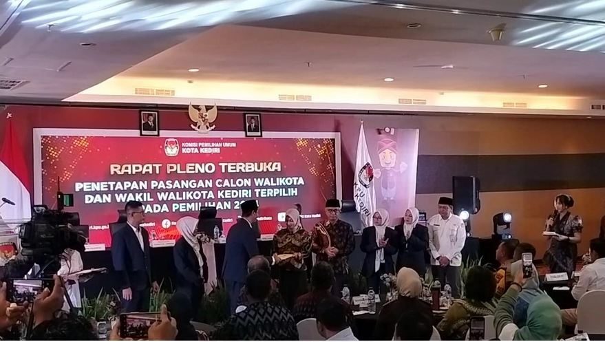 Kota Kediri – Javanewsonline.co.id | Komisi Pemilihan Umum (KPU) Kota Kediri secara resmi menetapkan pasangan calon Wali Kota dan Wakil Wali Kota, Vinanda Prameswati dan KH Qowimmudin Thoha, sebagai Wali Kota dan Wakil Wali Kota Kediri terpilih untuk periode 2024-2029. Penetapan tersebut berlangsung dalam sebuah acara yang digelar di Hotel Grand Surya, Kota Kediri, pada Kamis, 9 Januari 2025.