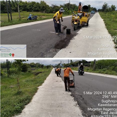 Magetan  –  Javanewsonline.co.id |  Selasa 5 Maret 2024 – Unit Pelayanan Teknis Dinas (UPTD) Bina Marga Dinas Pekerjaan Umum dan Penataan Ruang (PUPR) Magetan terus intensif melakukan pemeliharaan jalan rutin di wilayahnya. Pagi ini, perbaikan jalan dilakukan di ruas jalan Krajan Tulung dan jalan Mojopurno Genengan.