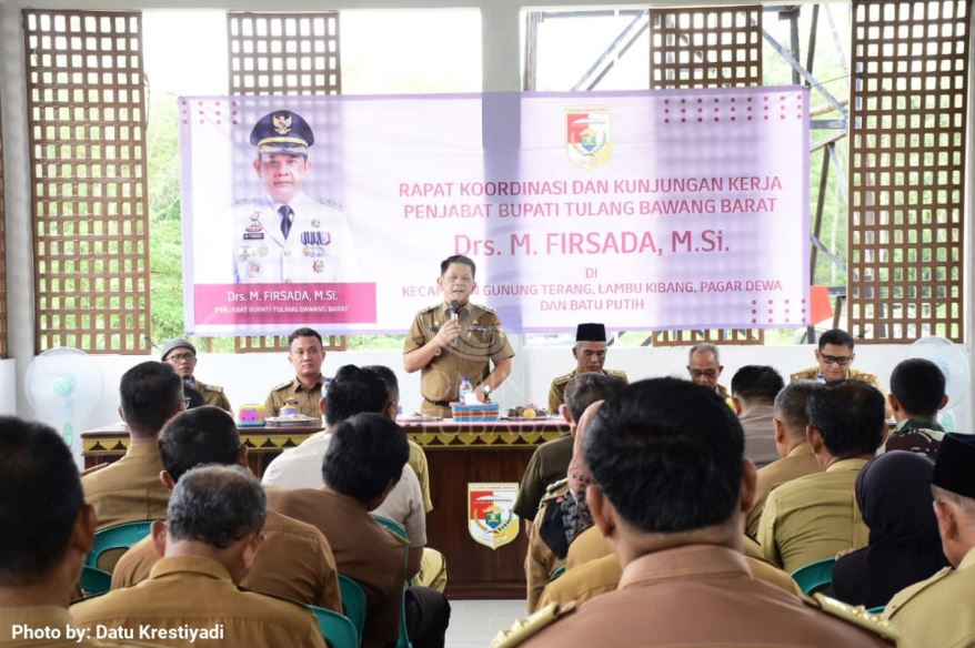 Tulang Bawang Barat – Javanewsonline.co.id | Penjabat Bupati Tulang Bawang Barat (Tubaba) Drs M Firsada MSi memberikan sambutan pada Rapat Koordinasi (Rakor) dan Kunjungan Kerja (Kunker) di Kecamatan Gunung Terang, Lambu Kibang, Pagar Dewa dan Batu Putih, Selasa (1/8).