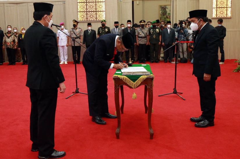 Serang – Javanewsonline.co.id | Penjabat (Pj) Gubernur Banten Al Muktabar melantik M Tranggono sebagai Penjabat Sekretaris Daerah (Pj Sekda) Provinsi Banten di Pendopo Gubernur Banten, KP3B Curug, Kota Serang, Senin (23/5/2022). Pelantikan berdasarkan Keputusan Gubernur Banten Nomor : 821/Kep.076-BKD/2022 tentang Pengangkatan Penjabat Sekretaris Daerah Provinsi Banten.