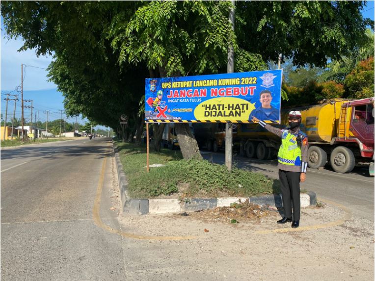 Dumai – Javanewsonline.co.id | Dalam rangka kesiapan jelang Operasi Ketupat Lancang Kuning 2022, Satuan Lalu Lintas Polres Dumai melaksanakan pemasangan spanduk himbauan serta peringatan kepada pengguna jalan untuk mengantisipasi atau mengurangi fatalitas akibat kecelakaan lalu lintas, Rabu (27/04/2022).