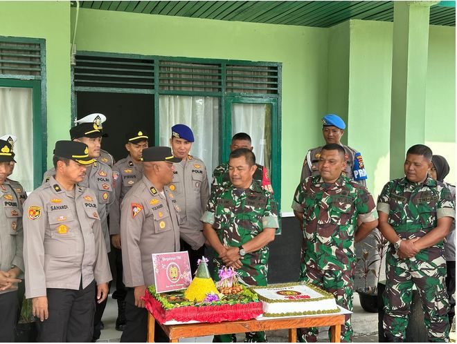 Pelalawan – Javanewsonline.co.id | Suasana keakraban dan kebersamaan tampak di Koramil 09/Langgam, Selasa, 6 Oktober 2025, ketika jajaran Polres Pelalawan memberikan kejutan berupa ucapan selamat ulang tahun ke-80 kepada Tentara Nasional Indonesia (TNI). Kegiatan ini dipimpin oleh Kabag Ops Polres Pelalawan, AKP Yulhairi, S.H., M.H., yang hadir mewakili Kapolres Pelalawan, AKBP John Louis Letedara, S.I.K.