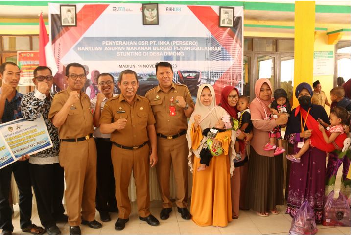 Sebagai bagian dari tanggung jawab sosial perusahaan, PT INKA (Persero) menginisiasi program Corporate Social Responsibility (CSR) dengan menyalurkan 280 paket bantuan asupan makanan bergizi kepada balita berisiko stunting di 14 desa Kabupaten Madiun, Jawa Timur. Penyerahan bantuan secara simbolis dilakukan oleh Pj Bupati Madiun Tontro Pahlawanto dan perwakilan PT INKA di Kantor Kepala Desa Dimong (14/11/2023).