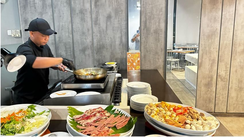 Meja-meja buffet tersusun rapi. Di satu sisi, chef beraksi langsung di depan pengunjung, mengolah potongan daging dengan gerakan cekatan di atas hot plate. Di sisi lain, pot-pot besar berisi kuah suki yang mendidih pelan, siap menyambut irisan tipis daging, jamur, dan sayuran segar. Di tengah ruangan, susunan sushi warna-warni menarik perhatian, berdampingan dengan aneka dessert manis yang tampil menggoda.