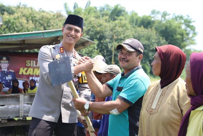 Sebagai bagian dari dukungan terhadap ketahanan pangan, Kapolres Magetan secara simbolis menyerahkan bantuan alat pertanian, seperti cangkul, kepada perwakilan Gapoktan.
