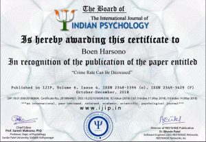 Ia berhasil membuat suatu penelitian/riset yang esensinya dapat menurunkan jumlah tindak kejahatan / kriminalitas. “Penelitian saya telah diperiksa oleh dua journal dan satu universitas. Journal yang pertama adalah International Journal of Indian psychology yang telah memeriksa dan mempublikasi penelitian saya,” kata Boen Harsono.
