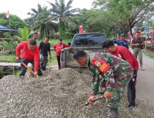 Teluk Meranti – Javanewsonline.co.id | Keakraban Satuan Tugas TNI Manunggal Masuk Desa (TMMD) ke-115 Kodim 0313/KPR dengan warga sekitar lokasi proyek sasaran fisik terjalin dengan baik.